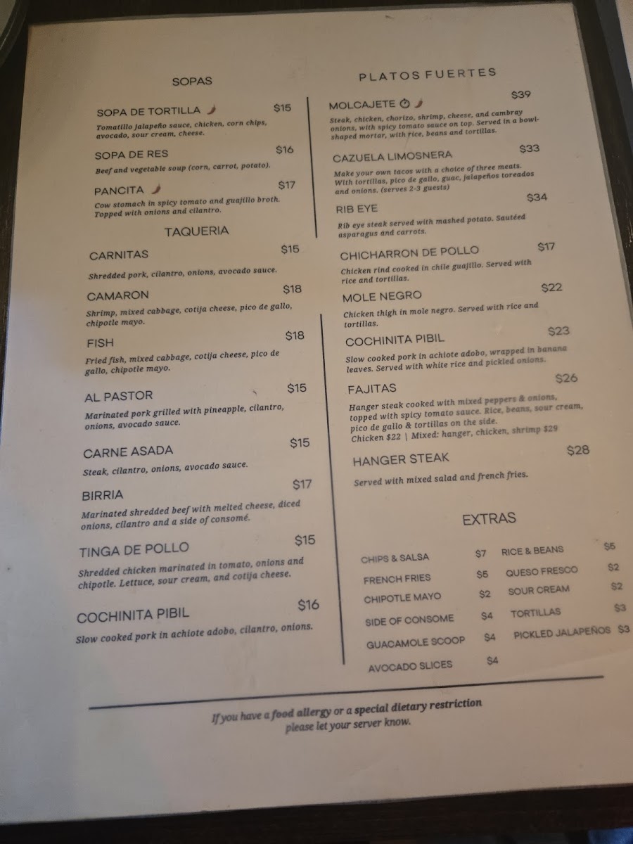The drinks menu features refreshing options like Hibiscus Juice and Agua De Tamarindo, each priced at just $6. For those craving a heartier meal, the taqueria showcases irresistible choices such as Carnitas and Chicken Tinga tacos, each priced at $12. The Esquite, a delectable corn off the cob dish, and the flavorful Guacamole are must-tries from the antojitos section.